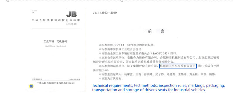《中华人民共和国机械工业标准JB/T 13693-2019》的标准起草单位之一 (工业车辆司机座椅的技术要求、试验方法、检验规则、标记、包装、运输和储存。)